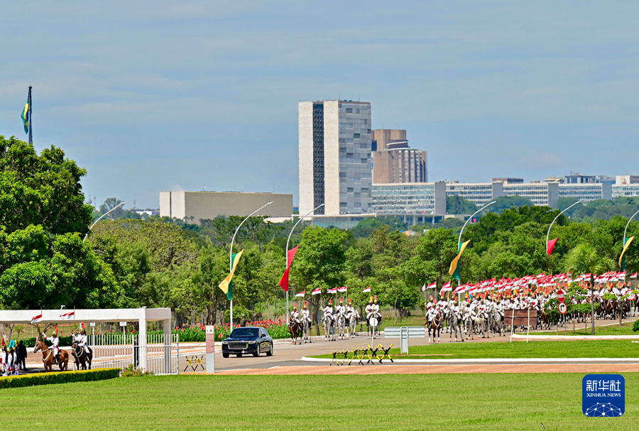 初夏時(shí)節(jié)的巴西利亞,天朗氣清。黎明宮內(nèi),綠草如茵,450名威武禮兵整齊列隊(duì)。在120名龍騎兵護(hù)衛(wèi)下,習(xí)近平乘車抵達(dá)黎明宮前廣場(chǎng)。