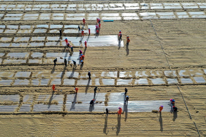 在新疆和田地區于田縣沙產業實驗基地,當地群眾在種植薏米(2025年4月8日攝,無人機照片)。新華社記者 丁磊 攝