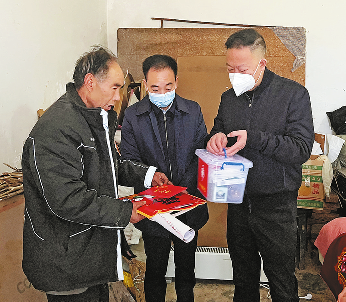 1月12日,山陽縣委組織部負責人帶隊來到高壩店鎮黃土凸村、高壩街社區、富橋村慰問駐村第一書記、駐村工作隊員,看望生活困難戶,為困難戶和監測戶送去愛心大禮包,確保基層群眾過一個祥和的春節。(本報記者 賈書章 攝)
