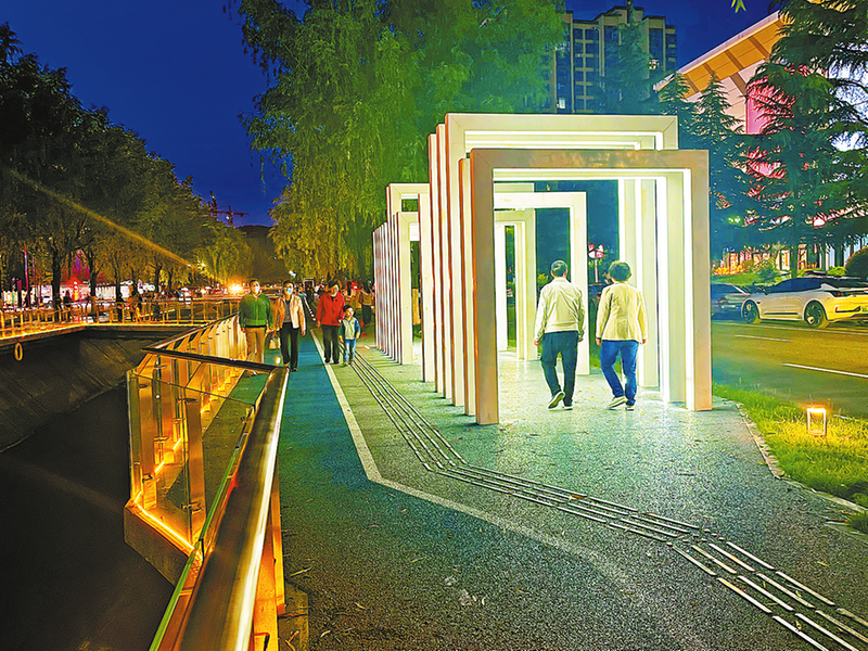 市區(qū)通江路兩側(cè)步道上,游人絡(luò)繹不絕。市民紛紛拿起手機,拍攝黃沙河改造后的美麗夜景。黃沙河沿岸從之前的道路狹窄、坑洼不平,變成如今整潔美觀的平坦步道,造型多樣的景觀燈柱在河水倒映下,為夜景增添了璀璨的現(xiàn)代氣息。