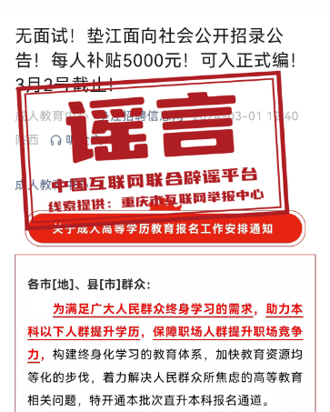 真相:近日,“墊江招聘信息網”微信公眾號發布信息:“無面試!重慶墊江面向社會公開招錄公告!每人補貼5000元!可入正式編!”部分網民看到該信息后誤認為,墊江面向社會以補貼形式招錄具有正式編制的公務人員,于是紛紛向墊江縣有關部門致電咨詢招錄情況。經核實,近年來,墊江未曾以補貼方式和不經過面試招錄具有正式編制公務人員。該信息實則為成人學歷提升培訓信息,而非正式編制公務人員招錄信息。墊江縣互聯網信息辦公室已依法對發布該信息的微信公眾號負責人進行約談和教育批評,指出虛假信息的危害性,并責令刪除相關信息。(來源:重慶辟謠)