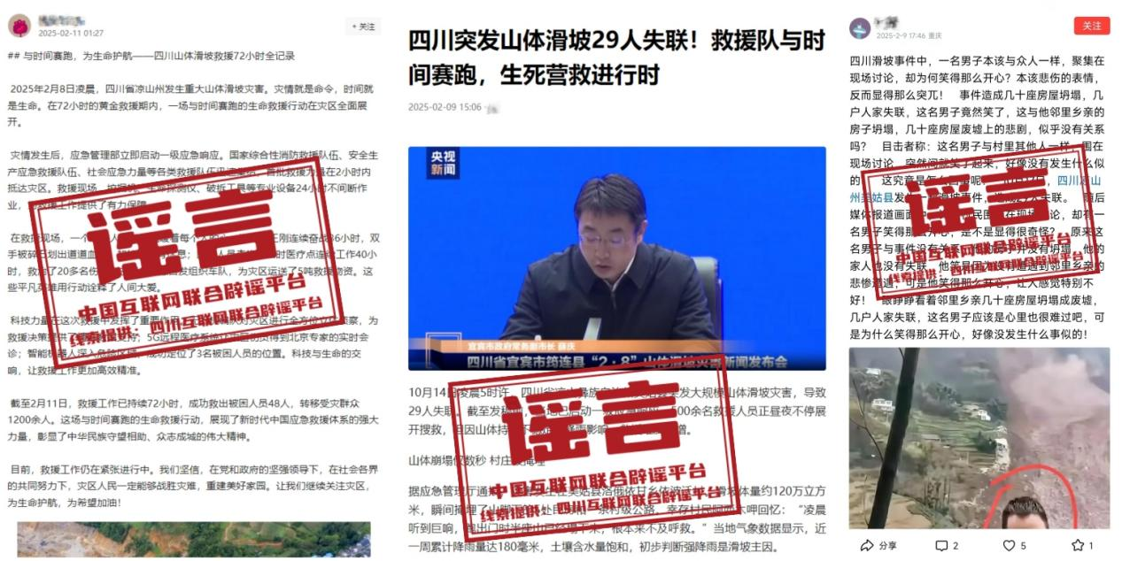 詳情:2025年2月8日,四川宜賓筠連發生山體滑坡已造成1人遇難、28人失聯,2人受傷。全民救援關鍵時刻,部分網民為吸引流量博取關注,在網上捏造不實信息、散布災情謠言、混淆大眾視聽,不僅擾亂了社會公共秩序,更對救援工作造成困擾。