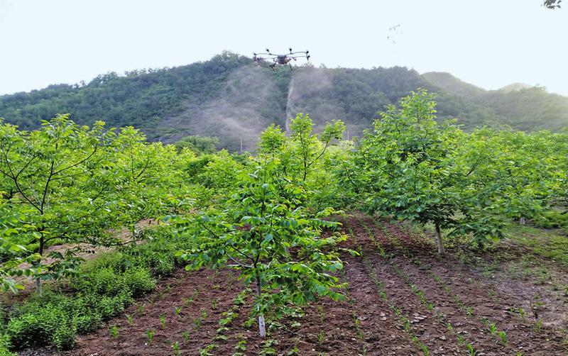 本次飛防,每架無人機懸掛10至20公斤藥品,每天覆蓋噴灑800畝以上。目前,兩村2300多畝核桃園已全面完成防治任務(wù)。與人工噴霧器打藥以及專用打藥車打藥相比,使用無人機進(jìn)行高空噴霧,效率大為提高,農(nóng)藥噴灑均勻、透徹、農(nóng)藥利用率可提高30%以上,對人力和財力的投入節(jié)省50%以上。