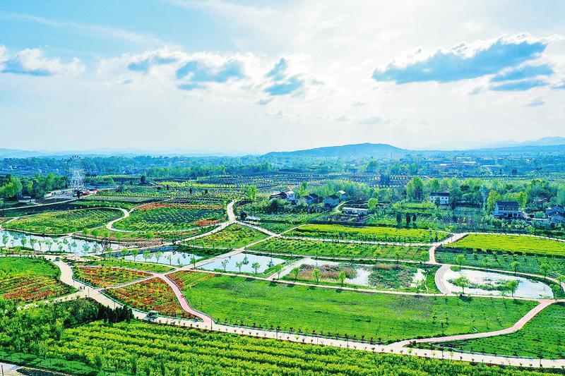 近日,洛南縣錦繡大地花博園內,郁金香、海棠、紫薇競相開放,形成花的海洋,迎接著各地游客的到來。圖為4月27日航拍的洛南縣錦繡大地花博園。
