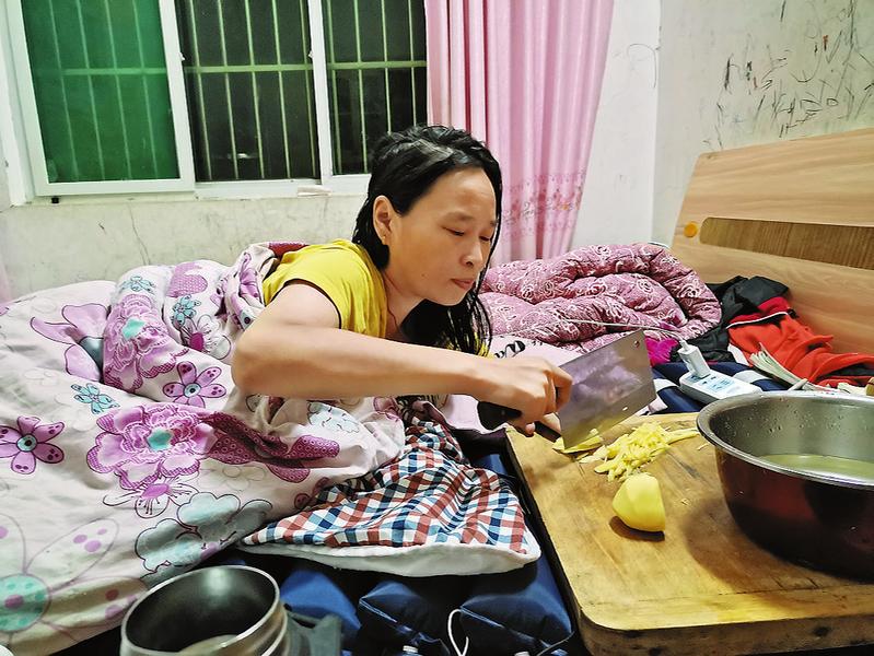 “像蟲一樣向前挪動著身體。”齊敏蟬說。她每天艱難地在床上做康復訓練,鍛煉胳膊和上身的力量,漸漸地,她可以隔兩個小時自己翻一次身;拿筷子時手不抖了,胳膊也有勁了,能自己吃飯了。丈夫忙的時候,給她把東西準備好,在床邊支個小桌子,她爬在床上切菜、做飯。最大的變化是,齊敏蟬不再那么怕別人異樣的目光,丈夫推她出去曬太陽,也能和左鄰右舍聊天了。