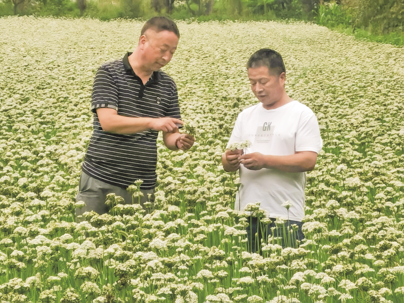 “這個季節(jié)的韭花開得正好,到9月就可以收韭菜籽。我們還育了幾畝地的苗子,長勢也很好,再過幾天就準備移栽。”聲音洪亮、熱情干練的郝坪村黨支部書記郝玉明說。