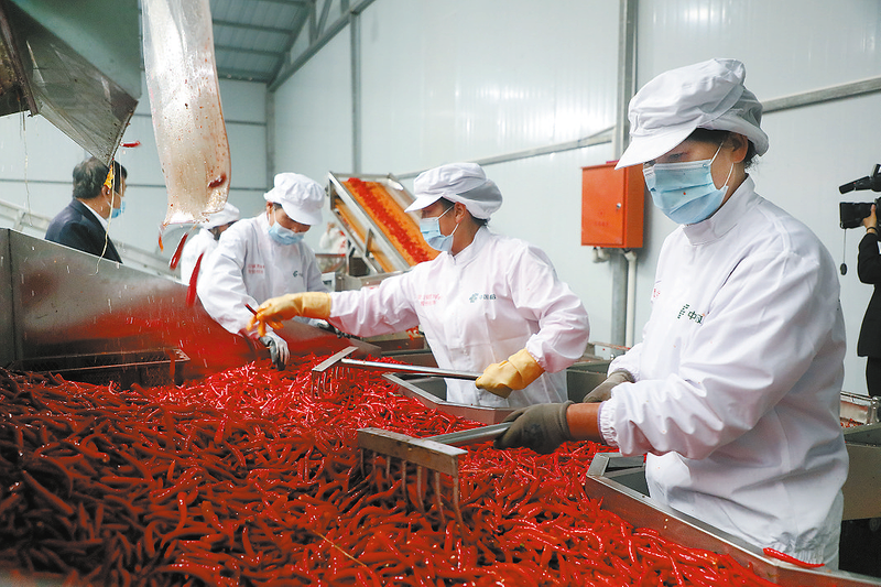 車間里,村民李春民和她的搭檔分工協作,仔細將一個個紅彤彤的辣椒挑揀、分類、去蒂、清洗。