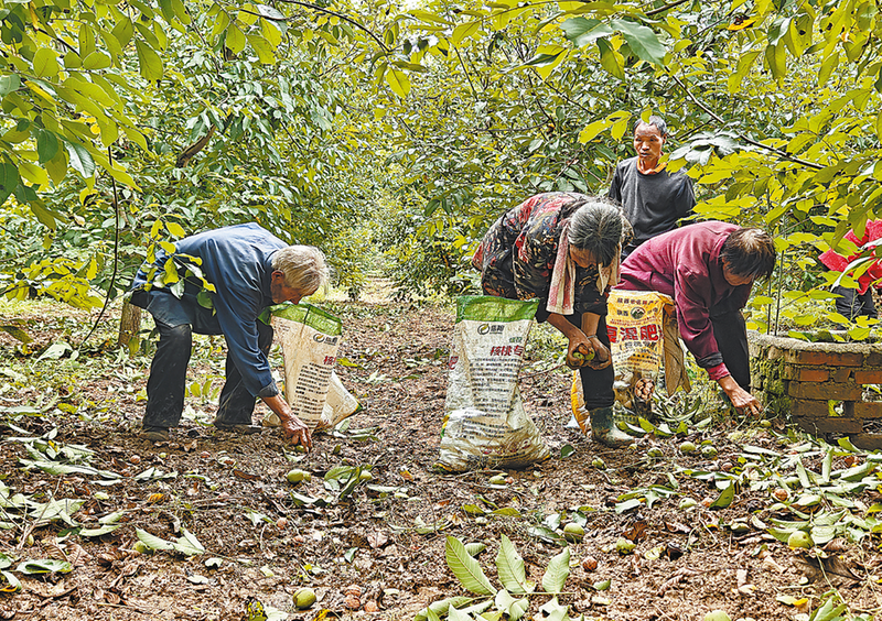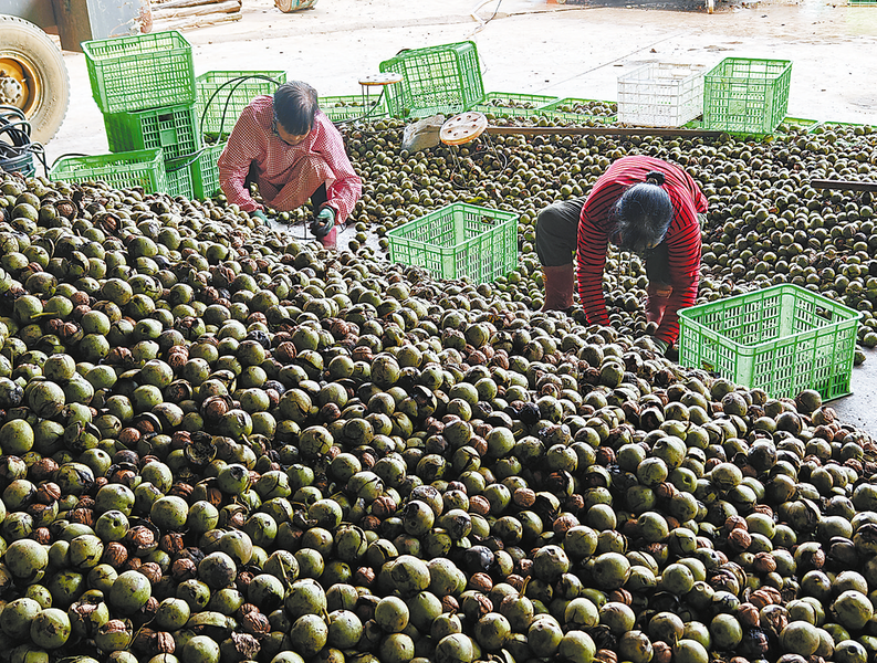 △剛剛從樹上打下來的鮮核桃,村民及時撿拾,收集后運送至廠區。