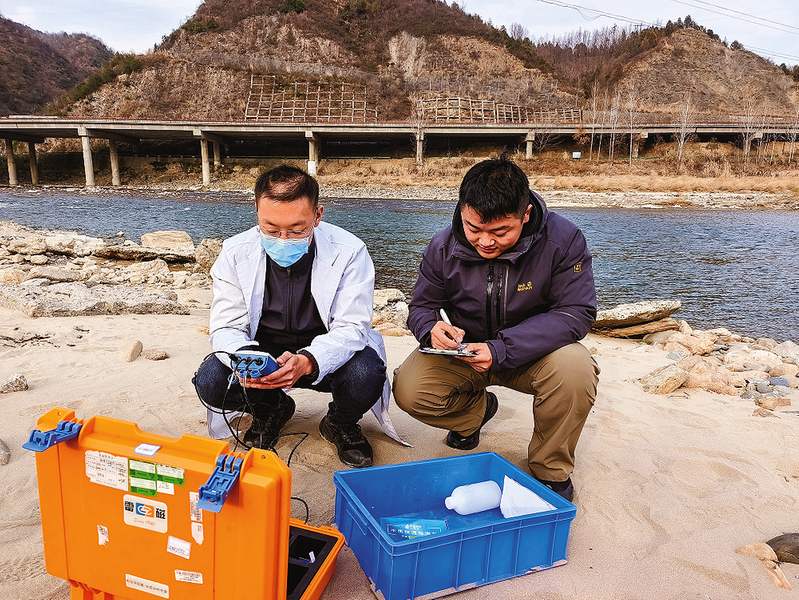 12月8日,在過風樓鎮丹江河畔,市生態環境局商南縣分局監測站的工作人員在采集水樣,現場初步檢測分析該水域環境狀況。