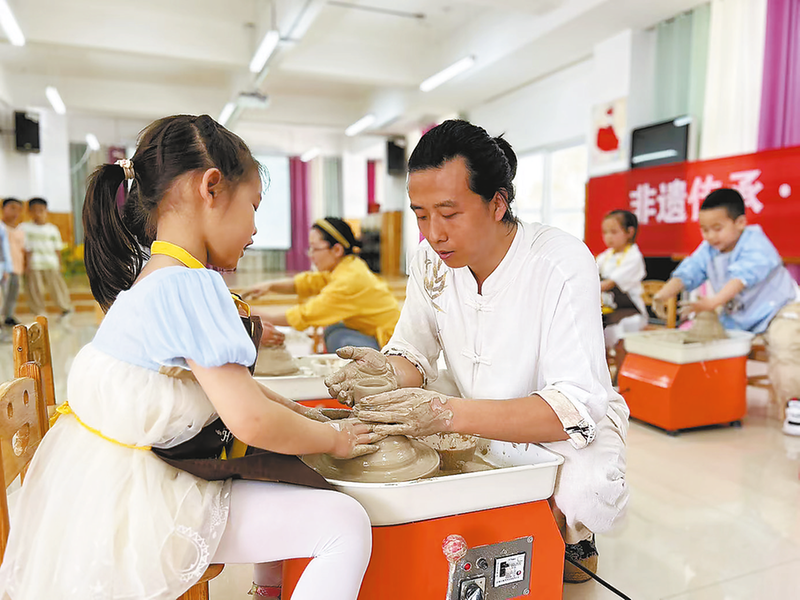 “非遺進校園”活動中,黃沖在鎮安縣第二幼兒園帶領小朋友體驗陶藝制作。(資料照片)