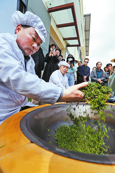 南京市高淳區援商技術人員、高級制茶師卜維梁現場教授制茶技藝。 (本報記者 方 立 攝)
